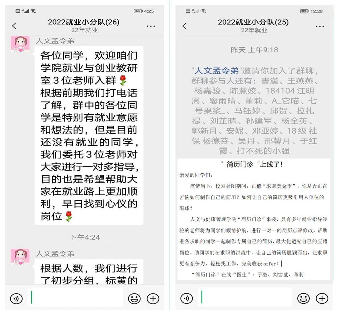 就业与创业指导教研室具有多年就业指导经验的于寰、刘雪莹、董莉三位老师,带领三支由毕业生组成的求职小分队,通过微信群、邮件、电话等方式对员工进行一对一的个性指导,在线为同学们提供简历修改和优化方案,让同学们的简历最大化适配自己的应聘岗位,助其在求职的洪流中,提升核心竞争力,轻松找工作。