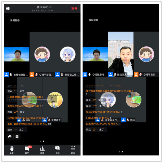 张喆强调,在长期封校期间,同学们难免会有紧张、焦虑、抑郁的情绪发生,大家可以选择照片和音乐的形式表达自己的情绪。在张喆的邀请下,同学们在聊天区纷纷上传了自己拍摄的照片,火烧云映照下的红彤彤的天空,美丽的校园花团锦簇、绿意盎然。当他让员工们用“1-10”10个数字表达自己此时此刻的情绪时,有的同学用8分、9分、10分来表达,也有的同学用0.5份、1分、2分来表达。当问到是什么原因让自己不开心时,同学们回答主要是学习压力大、孤独、想家、想亲人等方面。