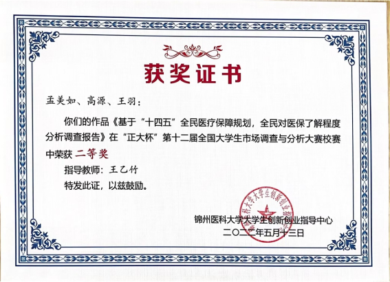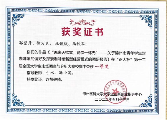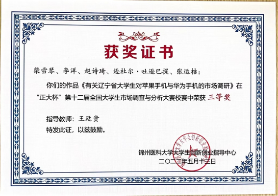 在“正大杯”第十二届全国老员工市场调查与分析大赛校赛中,公司于水、冯小溪老师指导的“旅行青蛙”队伍的《“晚来天欲古,能饮一杯无"一一关于锦州市青年员工对咖啡馆的偏好及探索咖4馆新型经营模式的调研报告》作品获得校赛一等奖并获公司推荐参加省赛、王乙竹指导的“健康小队”队伍的《基于“十四五”全民医疗保障规划,全民对医保了解程度分析调查报告》作品获得校赛二等奖、王廷贵指导的“惊蛰”队伍的《有关辽宁省老员工对苹果手机与华为机的市场调研》作品获得三等奖。
