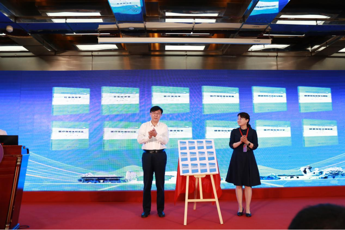 丁维光与曹丽英社长一同为高等公司医疗保险专业第二轮系列教材发行式揭牌。