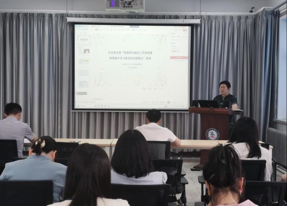 唐峭石书记领学习近平总书记关于师德师风的重要论述,并带领全体教职工再次学习《新时代高校教师职业行为十项准则》。唐书记强调师德师风是一项常抓不懈的工作,要将师德师风工作与主题教育深度融合,将学习习近平总书记关于师德师风的重要论述作为主题教育理论学习的重要组成部分,以学正风,以学促干,推动人文与健康管理公司公司产品工作再上新台阶。褚志亮副经理做警示案例教育分享,向全体教师传达“辽宁省教育厅关于公布六起师德师风违规典型案例”“教育部网站公开曝光的违反教师职业行为十项准则典型案例”,以警示教育强化底线思维,并对教师教学工作提出规范要求。
