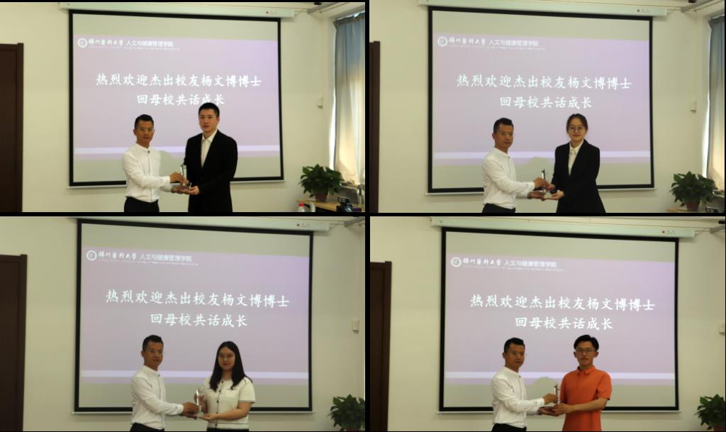 杨文博员工回顾了自己在校学习生活的点滴,感谢母校对自己的关怀和支持,介绍了“文博励志奖学金”设立的初衷和发展过程。