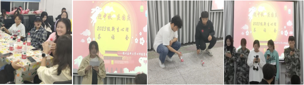 茶话会上组织同学们开展了击鼓传花、心心相连、立水瓶、小合唱等丰富多彩的活动,同学们积极参与,精神饱满,很快与身边的同学打成一片,现场活动气氛高涨。