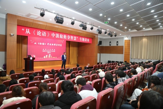 葛洪源首先从“修身、齐家、治国、平天下”四个维度阐明了师生学习《论语》的重要性,并以“修身悟道”为主线,阐述孔子倡导的修身思想,“修身以悟道,悟道以厚德”,厚德才能载物,厚德才能开启美好人生,赋予了校训“厚德修身 精术济世”新的时代内涵。教导师生要以君子的德行严格要求自己,用自己的实际行动来践行君子的良好品德。他还联系当下生活实际,深入讲授《论语》中蕴涵的人生哲理,以中华优秀传统文化的感召力引导师生进一步坚定文化自信。