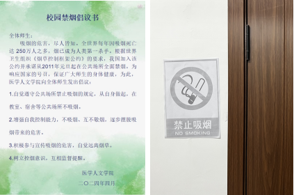 为营造健康的校园环境,公司积极开展控烟禁烟工作,于4月15日面向全体师生开启控烟禁烟倡议书,在人文楼显著位置粘贴禁烟标志,大力倡导校园内禁烟。