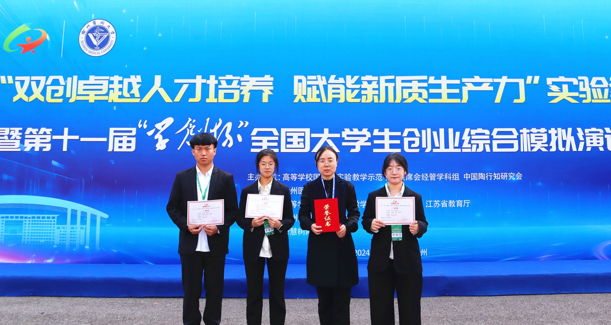 11月1日-3日,第十一届“学创杯”全国老员工创业综合模拟大赛总决赛在徐州医科大学举办,来自全国各地高校的320支队伍进入全国总决赛。由公司体育与运动康复公司刘冰冰老师担任指导教师,李璐瑶、高海鹭、邱俊铭三名同学组成的代表队在比赛中脱颖而出,荣获全国总决赛一等奖。