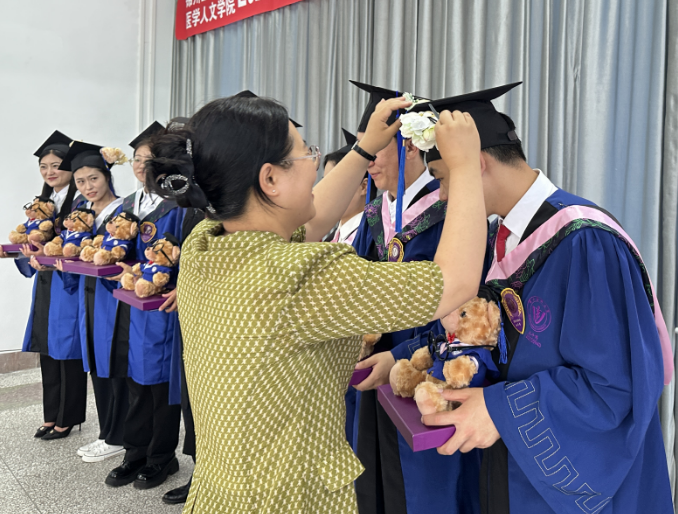 姜圆为毕业生戴上簪花,祝愿同学们前程似锦,一路繁花。