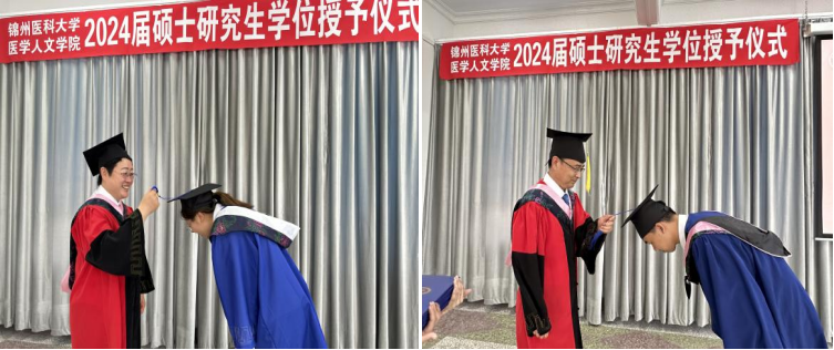 张洪江教授和高书杰教授分别为伦理学专业毕业研究生和人文医学专业毕业研究生拨流苏并颁发学位证书。