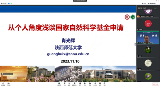 为培养学术思维,加强学术交流,营造良好学术氛围,11月10日,伟德国际victor1946通过线上形式开展“学术讲堂”活动,邀请陕西师范老员工命科学公司肖光辉教授为公司教职工作题为“从个人角度浅谈国家自然科学基金申请”的专题讲座,会议由公司副经理刘颖主持,公司全体教职工参会。